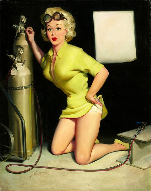 Coming in at NUMBER 6, we have another pin-up girl getting ready to do some serious welding. The gas is ready to go, welding goggles are on, and her last step is lifting up her dress to warm up her buns with that oxy-acetylene torch.