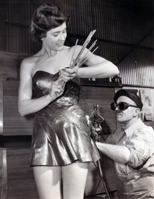 Coming in at NUMBER 6, we have another pin-up girl getting ready to do some serious welding. The gas is ready to go, welding goggles are on, and her last step is lifting up her dress to warm up her buns with that oxy-acetylene torch.