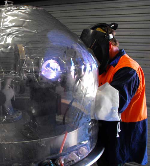 • Probably the biggest difference when welding titanium is the absolute requirement to maintain a shield on the weld’s backside on thinner materials where the back is affected by heat. With complex smaller parts, it is often desirable to use a glove box filled with argon. For larger parts, use special polyethylene purge gas chambers (glove bags). Arc-Zone.com sells a variety of these for many applications, including clamshell models to fit a variety of pipe sizes.